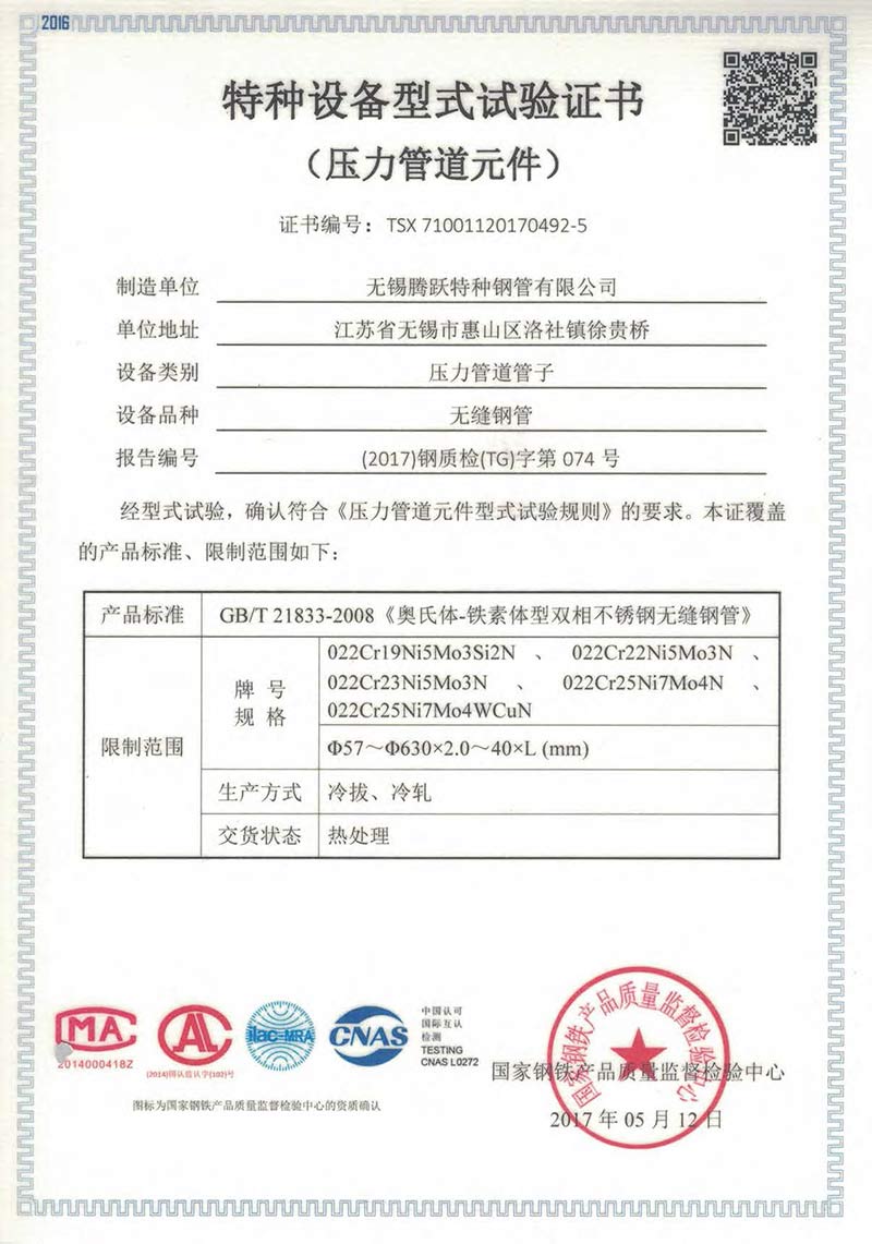 無錫騰躍特種鋼管有限公司創建于1987年,地處江蘇省無錫市惠山區洛社鎮。公司占地面積18萬平方米,現有員工350人,是一家專業生產不銹鋼無縫管的企業,年產能5萬噸。主要規格:外徑6~630mm、壁厚0.7~40mm。主要材質:奧氏體、奧氏體-鐵素體、鎳基合金等。 公司是中石化、中石油、中海油、核電的供應商網絡成員單位,是江蘇省AAA級信用單位。公司先后通過ISO9001質量管理體...