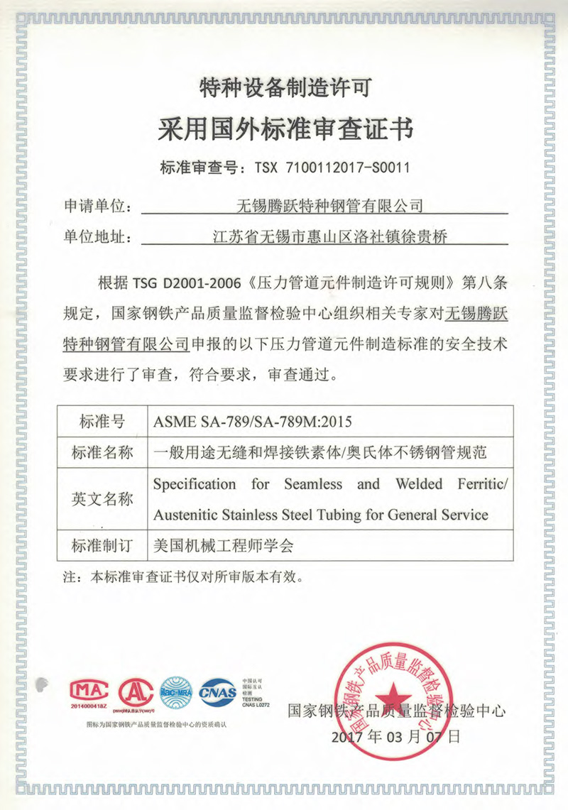 特種設(shè)備制造許可證采用國外標(biāo)準(zhǔn)審查證書